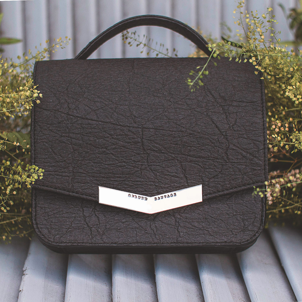 Allure Sauvage offre une alternative innovante à la haute maroquinerie en utilisant des sources végétales pour remplacer le cuir. Les collections sont actuellement réalisées avec du Piñatex®, à base de fibres de feuilles d’ananas.