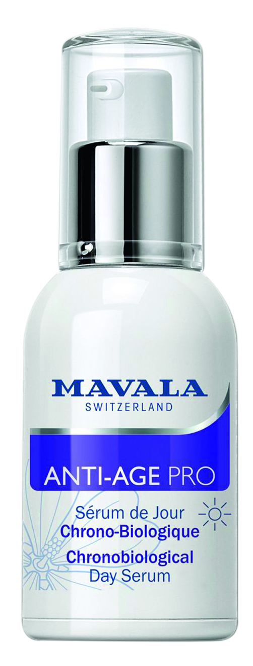 Anti-Âge Pro Chrono-Biologique Sérum de jour, adapté au biorythme naturel de la peau, optimise l’activité physiologique de la peau pendant la journée. Ce concentré anti-âge efficace protège la peau du stress quotidien et corrige les rides en seulement 14 jours. Le teint est éclatant de fraîcheur et de jeunesse. 6. Anti-Âge Pro Chrono-Biologique Sérum de jour, 30ml, CHF 44.70. www.mavala.com, disponible sur www.puravita.ch