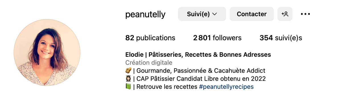 Elodie, passionnée de pâtisserie depuis son enfance, a toujours été celle qui apporte le dessert. Ses créations, du simple cookie au gâteau élaboré, ont évolué avec son inscription au CAP Pâtissier suite à la perte de son emploi en 2020, en pleine pandémie. Après avoir ouvert son compte Instagram en 2021, elle a participé à l’émission « L’Académie des Gâteaux » sur M6 en début 2022 et réussi l’examen du CAP en juin 2022. À mi-temps en tant que chef de projet data en freelance, elle consacre 1 à 2 jours par semaine à sa passion. Son rêve est de déménager à New York pour vivre de sa passion en proposant des ateliers de pâtisserie à domicile.