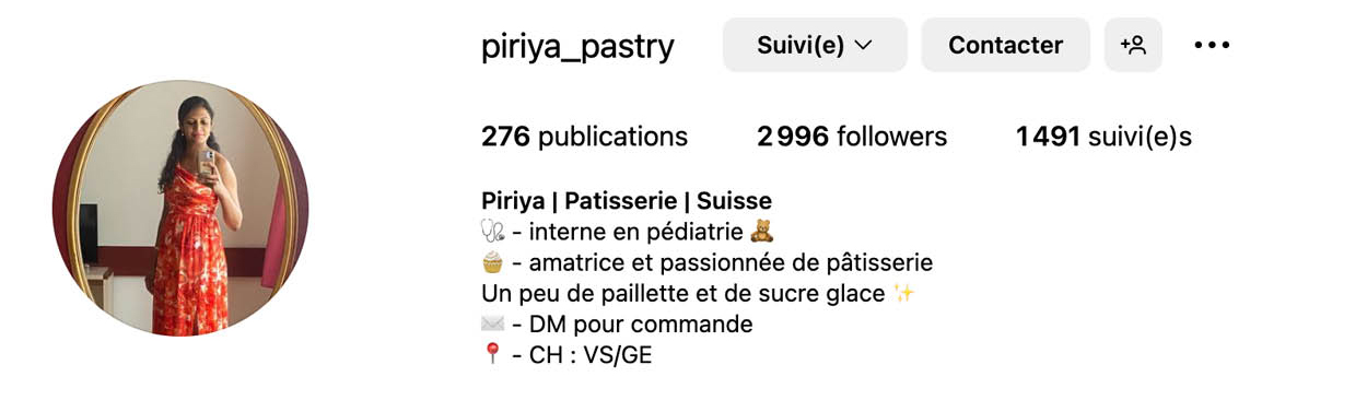 Piriya, interne en pédiatrie originaire de Sion, excelle également en tant que pâtissière amatrice autodidacte. Passionnée par l’art délicat de la pâtisserie, elle affectionne particulièrement la création de desserts fins et épurés, avec une prédilection pour les entremets et les tartelettes. Plongez dans son univers sucré en explorant ses créations sur Instagram! Pour toute commande, n’hésitez pas à envoyer un message privé sur son compte.