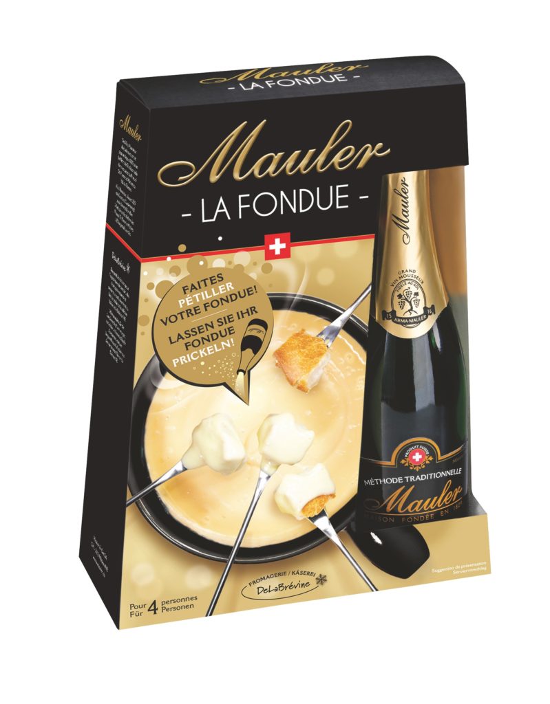 Son secret: la Cuvée Mauler Prestige Brut issue exclusivement de chardonnay et choyée dans les caves du Prieuré ainsi qu’un mélange de fromages suisses AOP de premier choix de la fromagerie de La Brévine. Un coffret qui met l’eau à la bouche, une fondue si simple à préparer, tellement chic et savoureuse. A offrir absolument à vos amis ou simplement pour vous faire plaisir. Succès garanti!