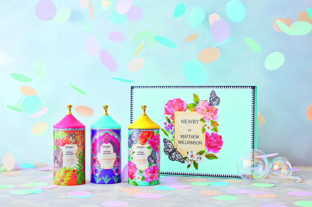 Le célèbre designer britannique Matthew Williamson s’est associé à la maison de thés londonienne Newby pour créer une collection de 3 mélanges de thés en vrac de qualité supérieure, en édition limitée: Maharaja’s Breakfast, Exotic Earl Grey, Jasmine Rose Garden. Il s’est inspiré du Rajasthan en Inde pour dessiner les motifs aux couleurs vives qui illustrent les boîtes. Disponible sur le site ou à la boutique flagship Newby à Gstaad.