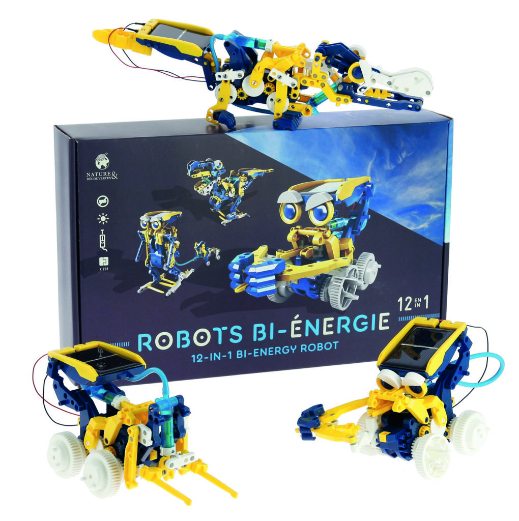 Avec «Robots bi-énergie 12 en 1» découvre l’ingénieur qui se cache en toi! Construis un robot ou un animal à partir d’un petit panneau solaire et d’une transmission hydraulique. Ton robot s’animera avec la lumière directe. Difficile de faire un choix? Pas de souci, tu peux recommencer à volonté. A toi de jouer! 12 modèles à construire, dès 8 ans.
