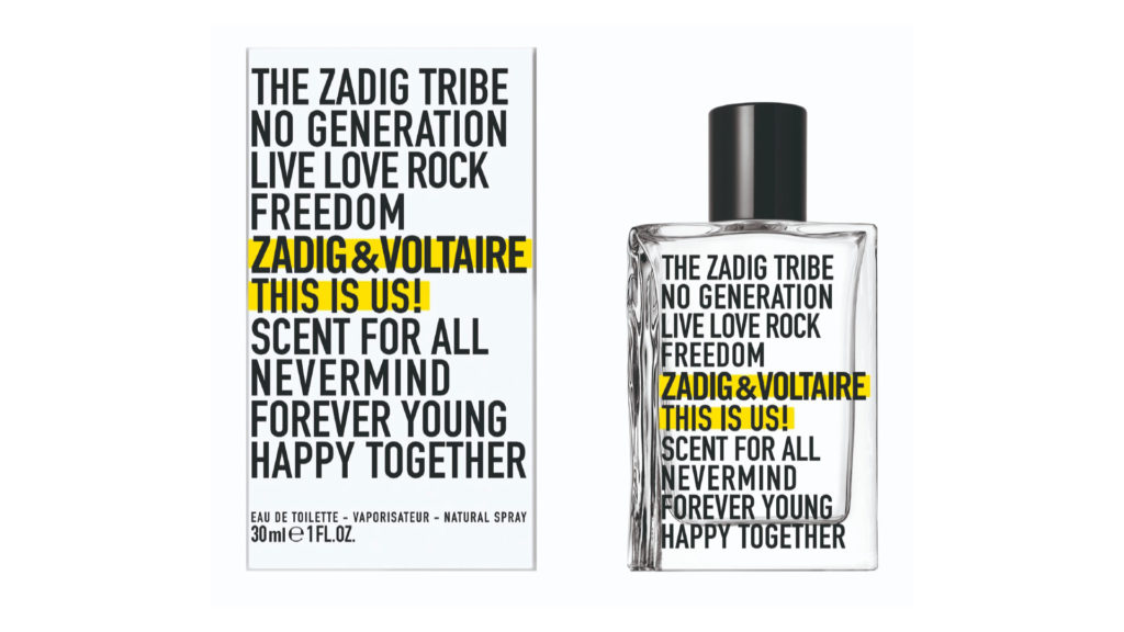 Signé Mathilde Bijaoui, le nouveau parfum THIS IS US! se porte comme on porterait un pull en cachemire, pièce emblématique du vestiaire Zadig & Voltaire: à même la peau. Le bois de santal, note de fond de THIS IS HER! et THIS IS HIM! bat ici ses envoûtantes pulsations en notes de cœur. On retrouve également le patchouli et les accords vanillés de la marque. Mais on se laisse surprendre par des notes musquées.