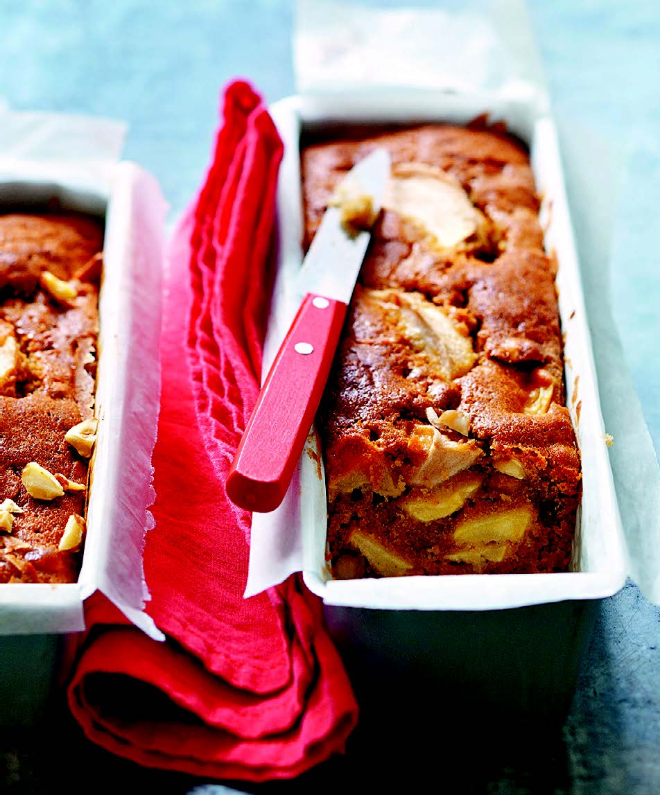 5. Versez la pâte dans un grand moule à cake d’environ 30 x 11 cm (ou deux d’environ 23 x 10 cm) tapissé de papier sulfurisé. Enfournez pour 1 h 10 environ (plantez une lame de couteau au centre du cake, elle doit ressortir à peine humide).
