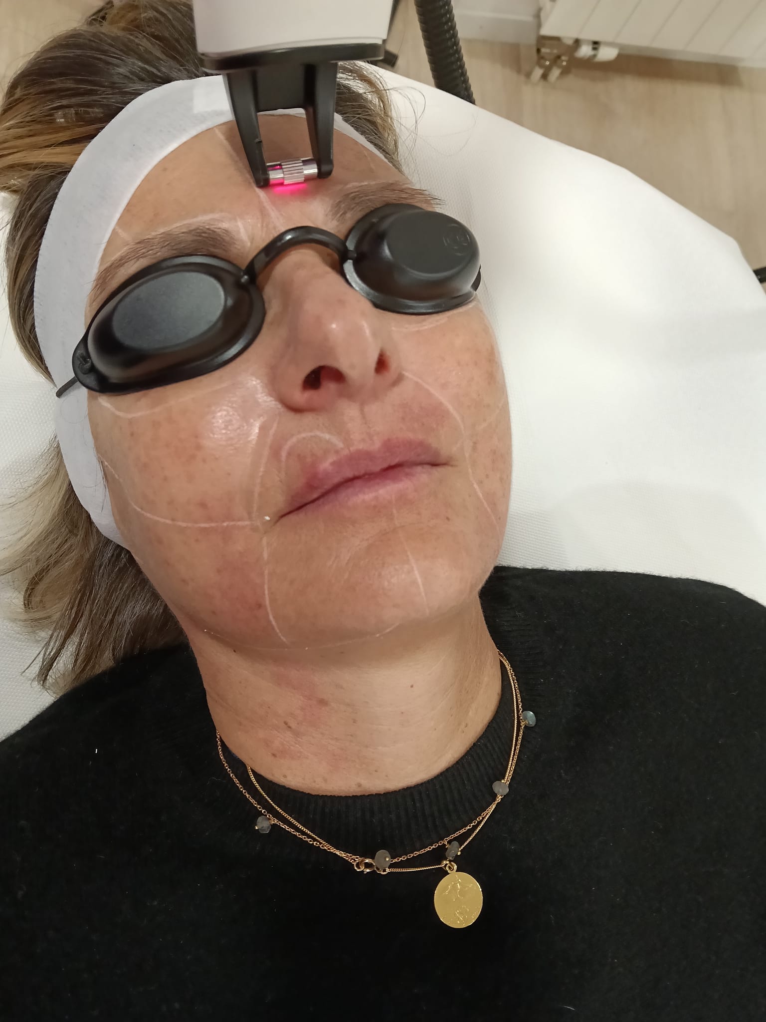 Chaque séance dure environ une heure. Installée confortablement, les yeux bien protégés, la séance commence par un premier traitement destiné à atténuer les taches brunes et les rougeurs. À chaque passage du laser, je ressens une légère sensation de chaleur.