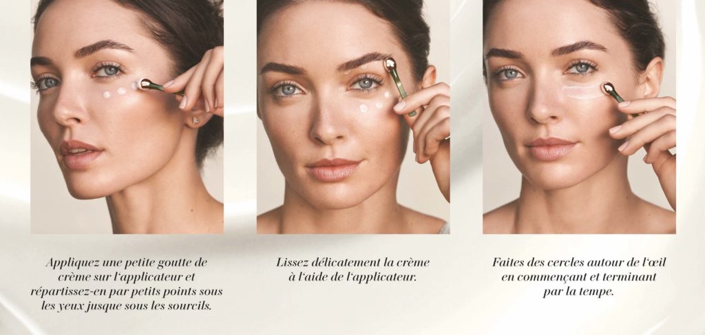 Le principe est de stimuler la microcirculation et la bonne pénétration par des techniques de massage pour accentuer l’efficacité de produit. Au moyen d’un applicateur en acier recouvert d’argent que l’on conserve au frigo, on dépose 5-6 gouttes du produit avant d’effectuer des cercles tout autour de l’oeil. L’applicateur agit comme un drainage lymphatique autour des cernes et lisse immédiatement le contour*.